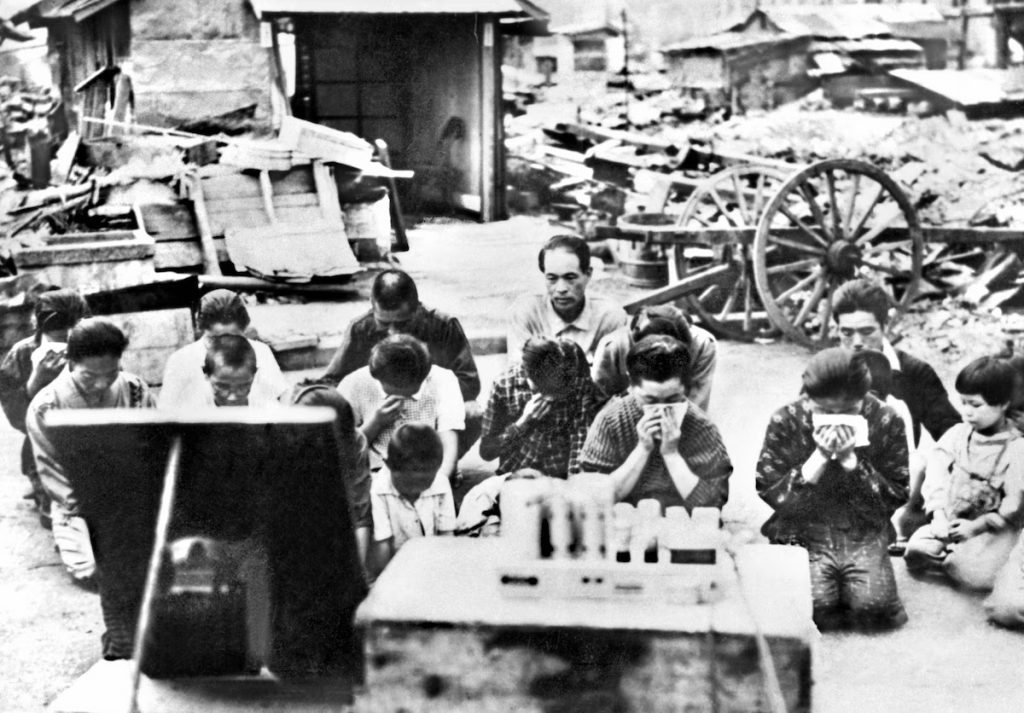 Image: People cry as they listen to the Aug. 15, 1945, radio broadcast of Emperor Hirohito announcing Japan’s surrender on the radio.